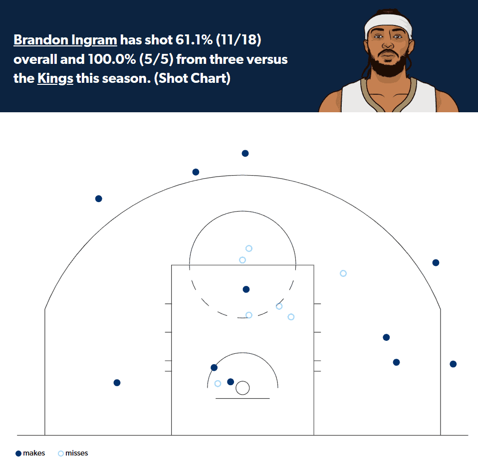 Just look at that shot chart for Brandon Ingram from Monday. It’s a mess: Ingram made shots from all over the floor, including plenty of low-percentage mid-range looks. That’s Ingram’s game, though — the star wing leads the NBA in mind-range makes per game (3.5) on the third-most attempts (7), beating out the likes of Kevin Durant and DeMar DeRozan in conversion rate. Ingram, now 26 years old, is proving that he deserves the “Baby Durant” nickname. Now the question s is whether he can keep rolling from mid-range tonight.