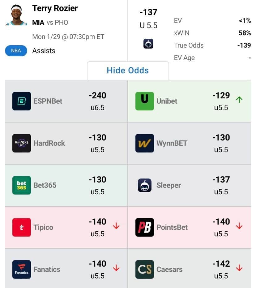 Sleeper is different from other pick’em sites in that they assign multipliers for each pick rather than site-wide implied odds. That makes it tough to land +EV picks. However, today we have a solid play, as Rozier less than 5.5 assists has a passable 1.73x multiplier to create -137 implied odds. With a 58% win rate and True Odds at -139, the play is +EV by about 1%.
