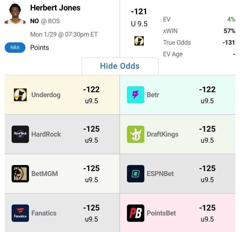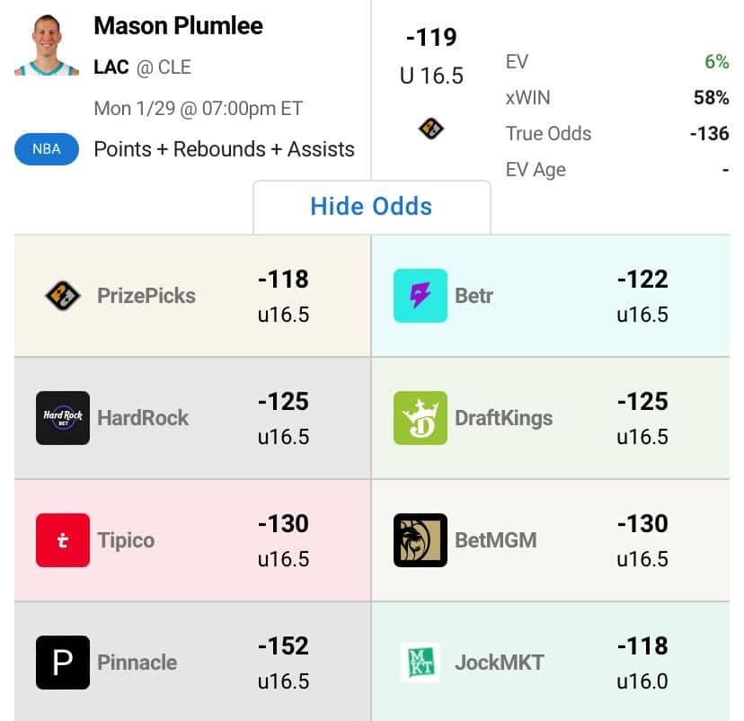 Are you having trouble making progress with your NBA pick’em plays? Well, we have the answer for you, and you can start seeing an upswing in your picks TODAY! Simply sign up with OddsShopper Premium for only $49.95 a month and immediately gain access to all sorts of +EV NBA picks tonight — if you sign up now, make sure to use the promo code CHEATSHEET at checkout to get 20% off! For now, we will give you just a taste of what OddsShopper Premium has to offer for the best DFS apps on Monday, Jan. 29: One pick each from PrizePicks, Sleeper Fantasy, Underdog Fantasy and Betr Picks. We will also show how the picks for each pick’em site compare to projections set by betting markets and other DFS apps so you can see how the value stacks up!