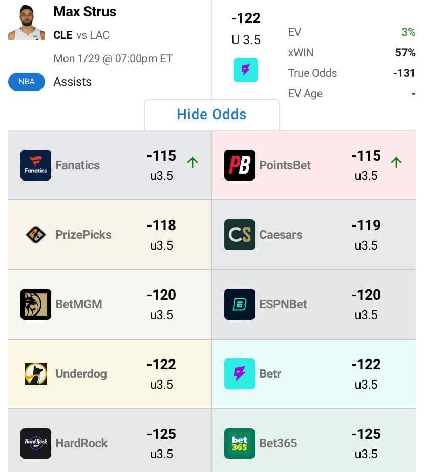 Betr Picks is close to Underdog in the implied odds department, going -122 across the app. Strus less than 3.5 assists has an expected winning percentage of 57%, which is giving it -131 True Odds. Given the Betr Picks odds, that makes this play +EV by 3%.