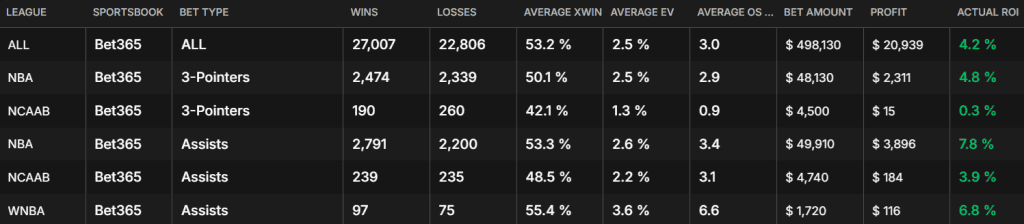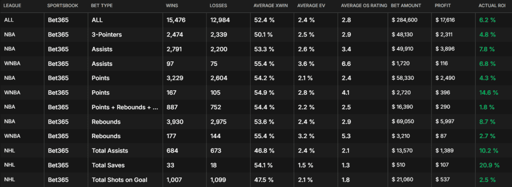 Experiment with OS rating and EV range filters to find the sweet spot. For bet365, moving the minimum OS rating to 2 bumps up our overall ROI to 8.5%, but it also turns some markets negative: WNBA assists and rebounds, and NBA points + rebounds + assists.