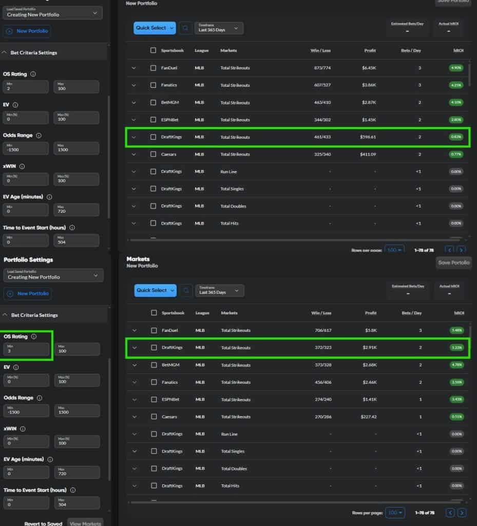 By default, the Portfolio Lab sets the “OS Rating” filter to 2. That’s a decent baseline for expected value — but if you’re targeting the best strikeout props today, especially on DraftKings, you can do better.