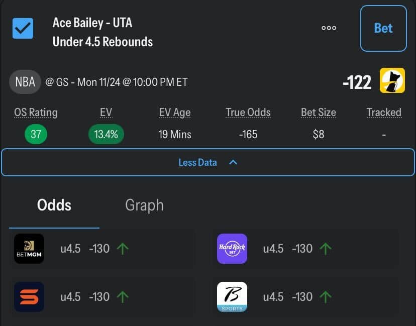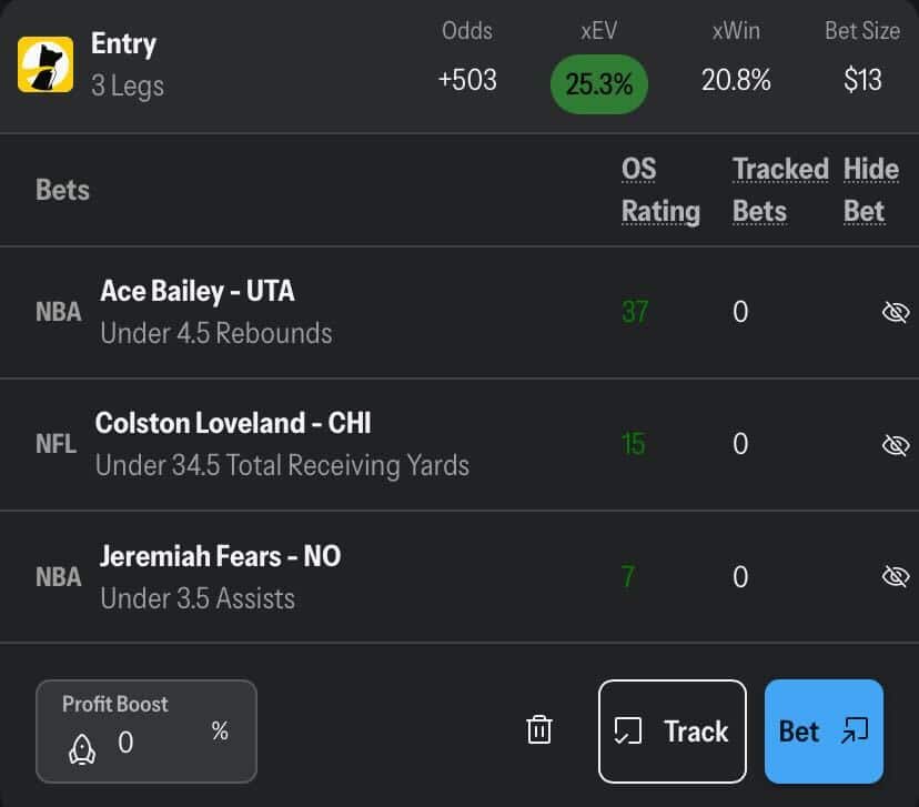 Portfolio EV updates instantly. If sportsbooks move a backup running back’s rushing line from 36.5 to 48.5 because RB1 is ruled out, and pick’em platforms still show 36.5, Portfolio EV identifies the stale line immediately. These plays are often the highest EV opportunities you’ll encounter each week.