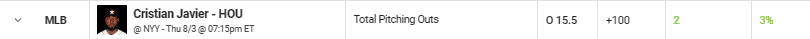 OddsShopper’s Premium Tool has the true odds for Javier over 15.5 pitching outs at -105, so this bet is beating the market at +100. It is also getting a solid 3% and greater than a 50% chance of hitting, leading to a recommended bet size of $9. As such, Javier over 15.5 pitching outs gets the top value spot for Thursday’s Astros-Yankees game.