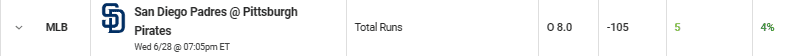 MLB Total: San Diego Padres vs. Pittsburgh Pirates Over 8.0 Runs (-105, Caesars)