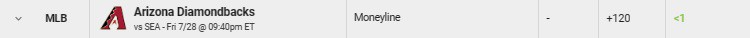 MLB Side: Arizona Diamondbacks Moneyline (+120, FanDuel)
