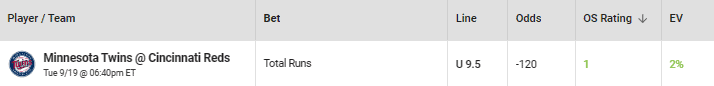MLB Total: Minnesota Twins vs. Cincinnati Reds Under 9.5 Runs (-120, BetMGM)