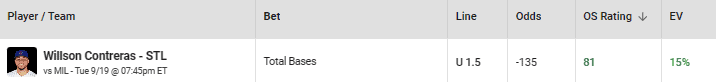 MLB Player Prop: William Contreras Under 1.5 Total Bases (-135, PointsBet)