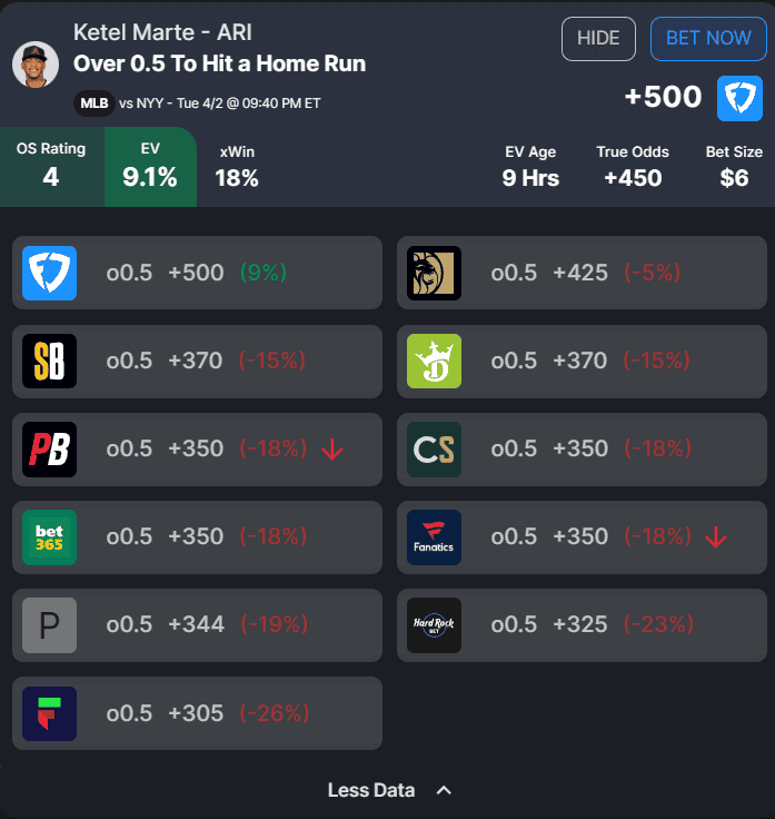 But that is mostly meaningless here because we’re playing the market. Marte’s true odds of hitting a home run tonight are +450, with most sportsbooks below that.