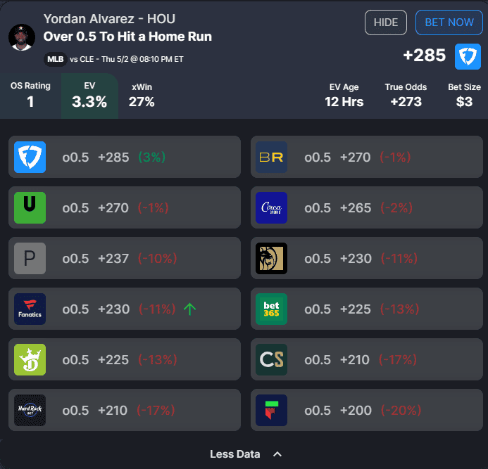 Thursdays are light in the MLB, and with only one game on tap for the evening slate (Cleveland Guardians at Houston Astros), so we’re going to turn attention to that game for two picks. I’ve dug up two MLB player prop bets and one home run pick with help from our MLB betting model. If you haven’t tried out the +EV betting tools I’ve been using to pay my rent for the last few months, you can get them for 50% off — keep scrolling to see the exclusive coupon code!