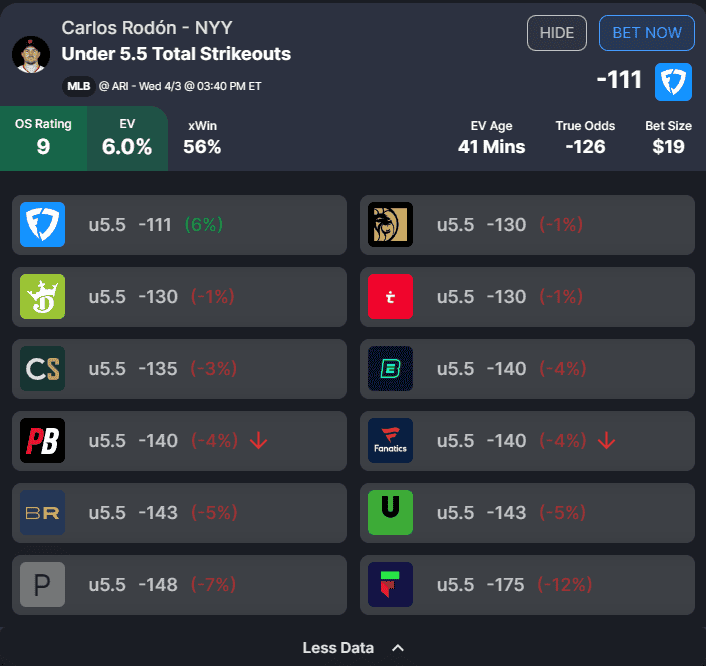 I love the handful of LHHs the Blue Jays will use today, but I’m turning to our MLB betting model to help me flesh out the rest of my MLB player prop card. This pick for LHP Carlos Rodon looks like a great bet as he prepares to face a feisty Arizona Diamondbacks squad. Rodon’s 5.34 xERA (14th percentile) and 22.4% strikeout rate (41st percentile) were both well below average last season, and he now draws an Arizona team that leads the MLB in strikeouts taken per game (6).