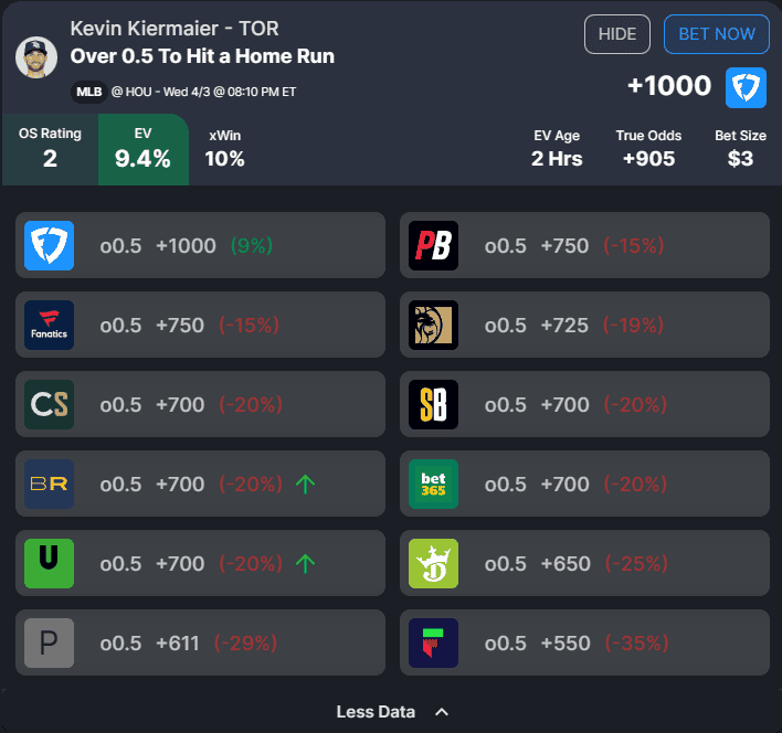 FanDuel is charging only +1000 for a bet that you’ll find trading for +750 or worse at every other public book — and +611 at Pinnacle! You’ll have to head to FanDuel for this one because this wager doesn’t have +EV anywhere else.