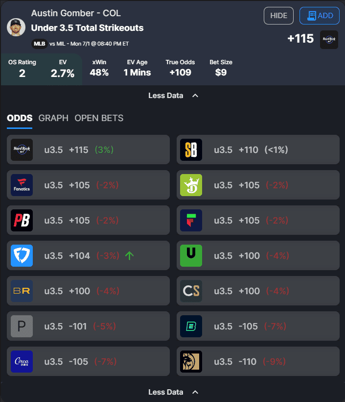 Here, Gomber’s true odds of staying under 3.5 total strikeouts are calculated to be +109. Most public books are under that number, but not Hard Rock and SuperBook.