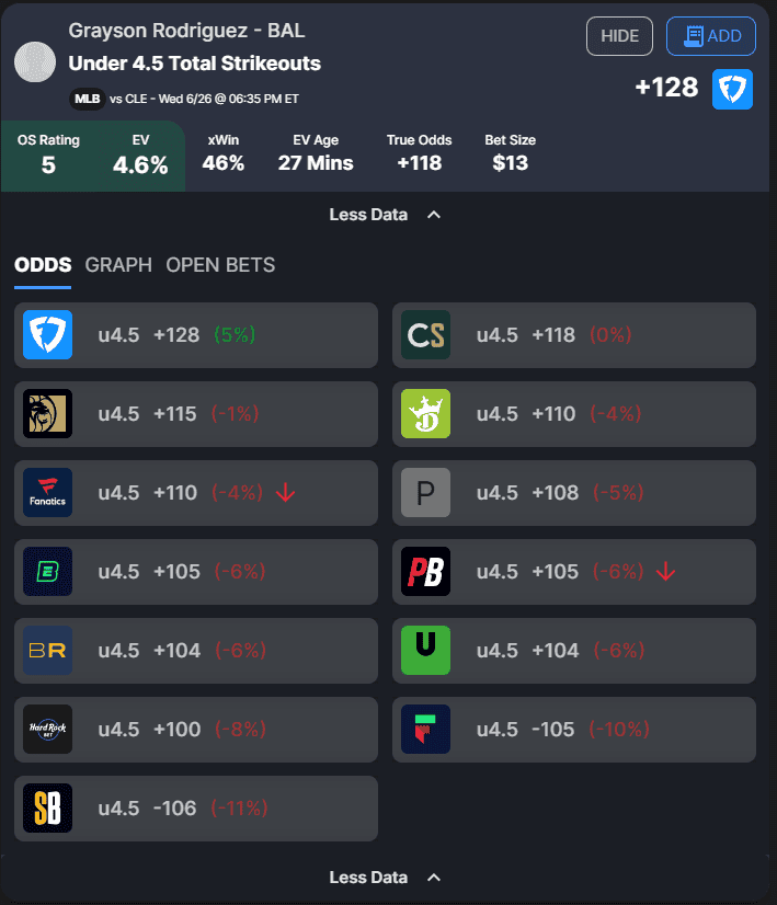 In this example, Rodriguez’s true odds of staying under 4.5 total strikeouts are estimated to be +118, a number is beating the price available at FanDuel.