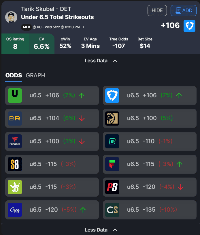 While Skubal clocks in at +106 to stay under 6.5 strikeouts at FanDuel, the same wager is trading at odds between +100 and -120 at most public books. Caesars, the sharpest of the public books, has this one at -135.