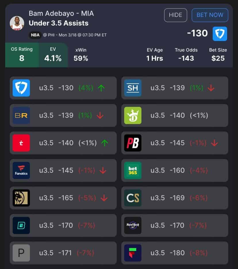The odds at FanDuel on Adebayo under 3.5 are solid at -130 against True Odds of -143 — every other book is pushing -140 at best. With a 59% win expectancy on the under, those odds make this play +EV by 4.1%.