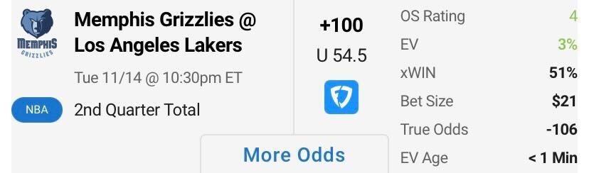 The Free Bet Converter is similar to the Arbitrage Betting tool, only the Free Bet Converter guarantees profitability by specifically targeting sportsbook bonus bets. With today’s play, you will want to target the Lakers alternate spread of -12.5 (+285) at DraftKings, then place a 2.143x bet on the Grizzlies +12.5 at BetMGM (-300). This will lead to a profit of $7.07 on a $10 initial bet. For a full explanation of this process, check out our breakdown here.