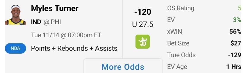 NBA Player Prop: Myles Turner Under 27.5 Points + Rebounds + Assists (-120, DraftKings)