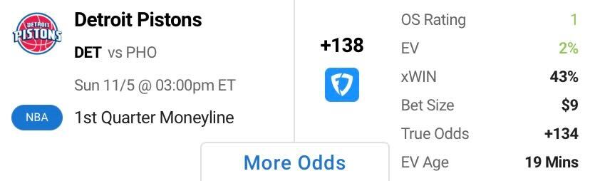 NBA Side: Detroit Pistons First Quarter Moneyline (+138, FanDuel)