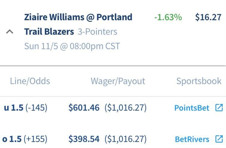 Arbitrage betting in sports is taking advantage of line discrepancies between bookmakers and betting all potential outcomes at different sportsbooks. Regardless of the result, these bets are guaranteed to be profitable since the payout for winning on either side of the bet exceeds the total amount wagered. This bet below pays out $16.27 on a $1,000 bet.