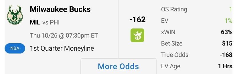 NBA Side: Milwaukee Bucks First Quarter Moneyline (-162, DraftKings)