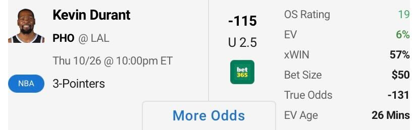 NBA Player Prop: Kevin Durant Under 2.5 3-Pointers (-115, bet365)