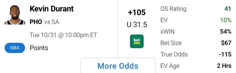 NBA Player Prop: Kevin Durant Under 31.5 Points (+105, bet365)