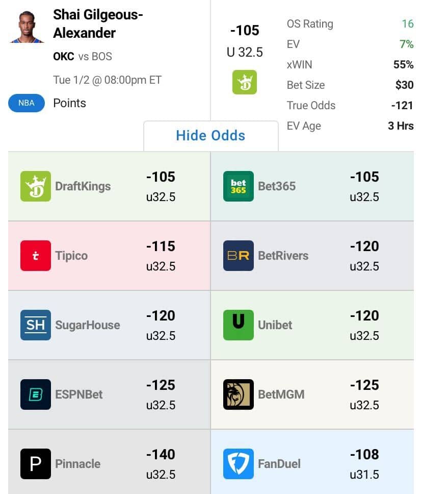 If you’re looking for some player prop action on this Celtics-Thunder game, OddsShopper’s betting model found a key pricing disparity. Shai Gilgeous-Alexander is -105 on DraftKings to fall short of his high line of 32.5 points, which is below the true odds of -121 and well below sharp book Pinnacle (-140). That makes this wager on Gilgeous-Alexander a +EV Bet by a whopping 7%%. For the rest of our model’s projections — more than just the NBA — subscribe to OddsShopper Premium!