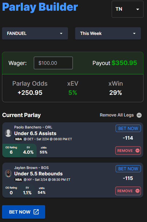We’ve got a tiny NBA card on tap this evening, with only three games for us to talk about. Still, we’ll have a leg for the marquee game between the Boston Celtics and New York Knicks on ABC. Most of my action is just straight NBA player prop bets, but I used our parlay builder to pick out a solid NBA parlay bet for a decent payday. The parlay, which features a Jaylen Brown player prop pick, has odds of +250 at FanDuel. If you’re interested in how OddsShopper’s parlay builder works, you can check out our how-to guide here!