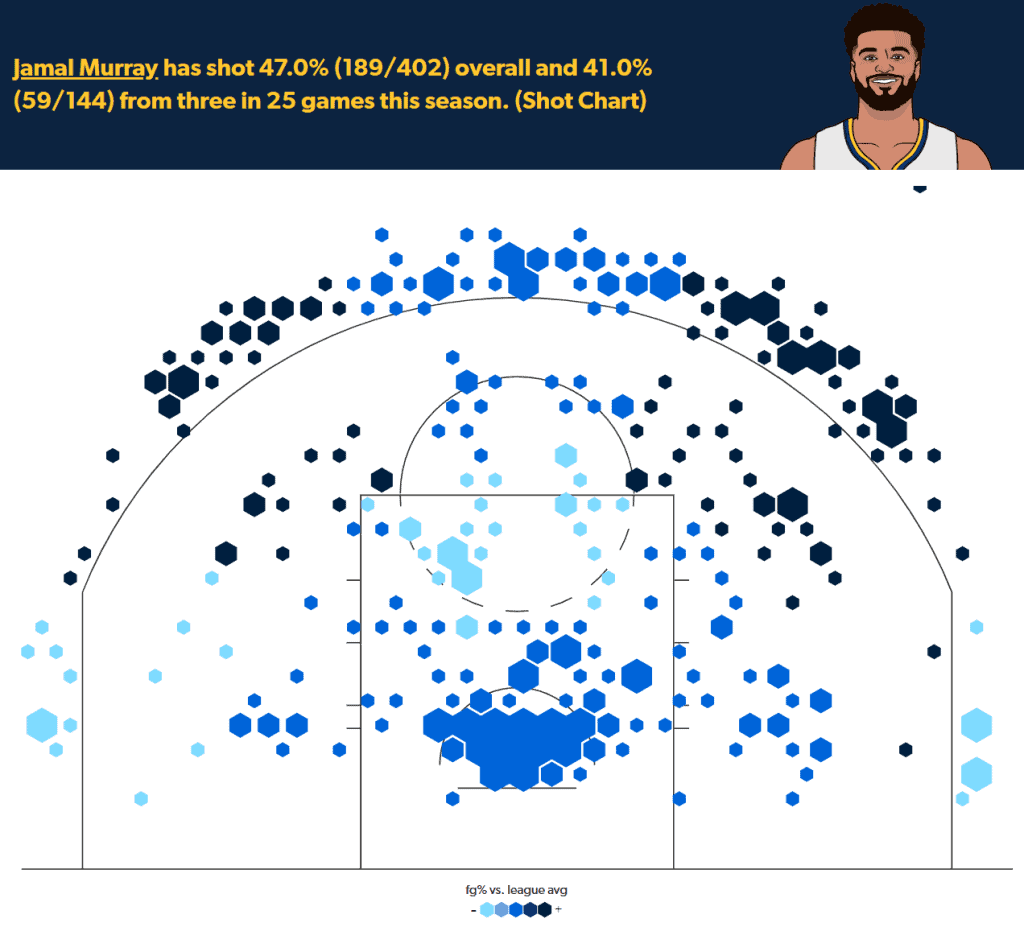 Despite the unfavorable scheduling for New Orleans, I’m fading a key part of Denver’s offense: Jamal Murray. His shot profile doesn’t match up well versus New Orleans. Murray takes 7.2 shots per game from either the mid-range or the non-restricted paint. He also takes 5.5 shots from above the break. Those attempts constitute 75.7% of his total shots.