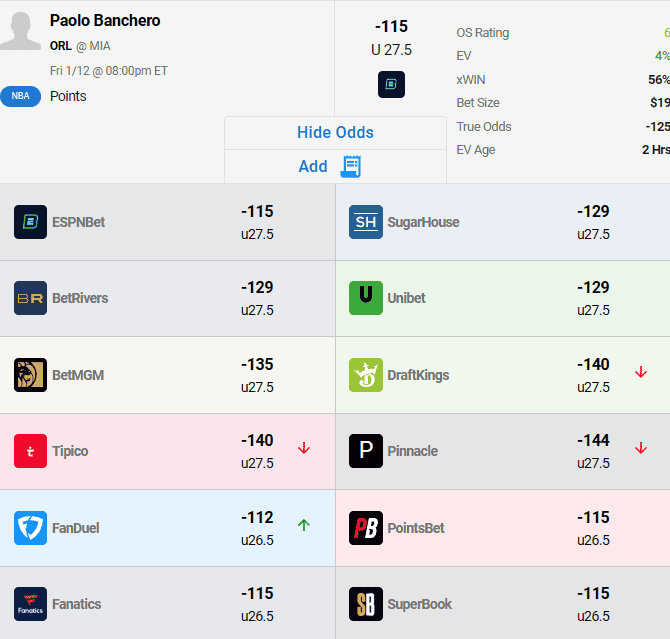 Stats aside, our NBA betting tools want action on this Paolo Banchero under today because of some market inefficiency. The under 27.5 is priced at only -115 (53.5%) at ESPNBet — which is worse than the true odds of -125 (55.6%). Pinnacle, a sharp book, has the under 27.5 priced down at -144 (59%). OddsShopper calculates true odds by indexing odds available at all books and adjusting for book sharpness and hold.