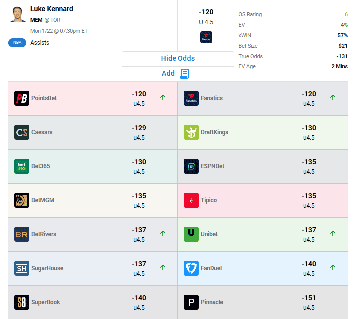 Stats aside, our NBA betting tools want action on this Luke Kennard under today because of a clear market inefficiency. The under 4.5 is priced at only -120 (54.6%) at Fanatics — which is worse than the true odds of -131 (56.7%). Pinnacle, a sharp book, lists the under 4.5 for -151 (60.2%). OddsShopper calculates true odds by indexing odds available at all books and adjusting for book sharpness and hold.
