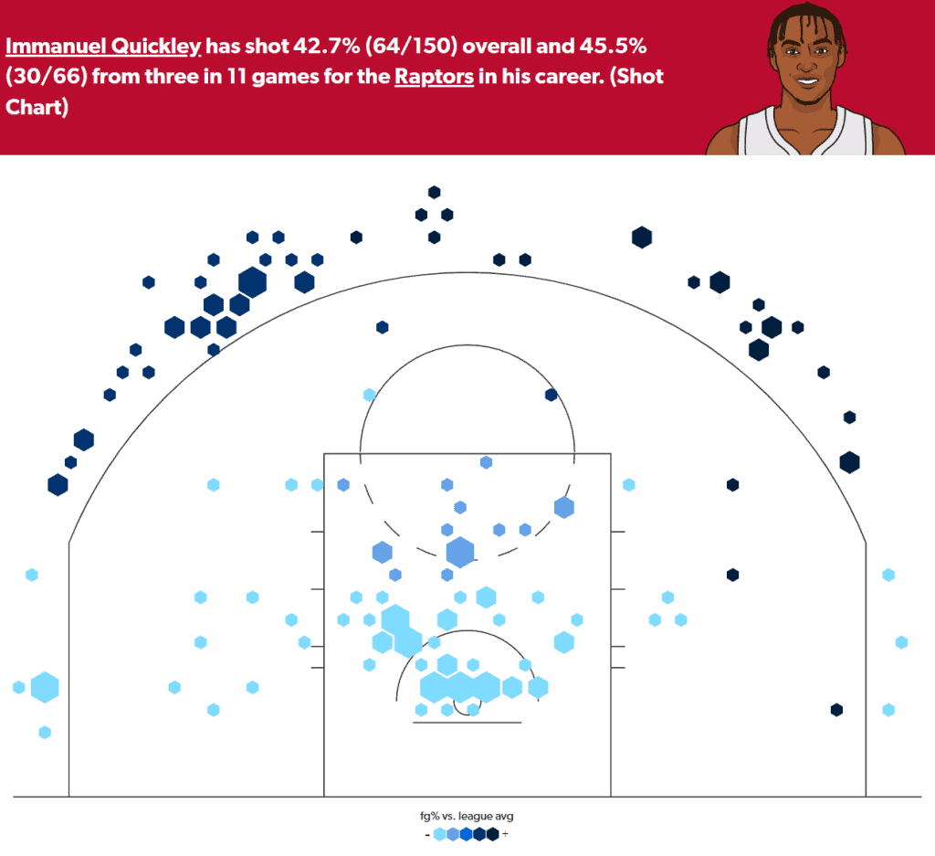 It’s easy to tell what Immanuel Quickley has been doing well since joining the Toronto Raptors: cooking teams from outside the paint, especially from above the break. Tonight’s matchup against the Memphis Grizzlies bodes well for him because of his shot profile. Memphis has been somewhat stingy inside but has struggled to defend outside.