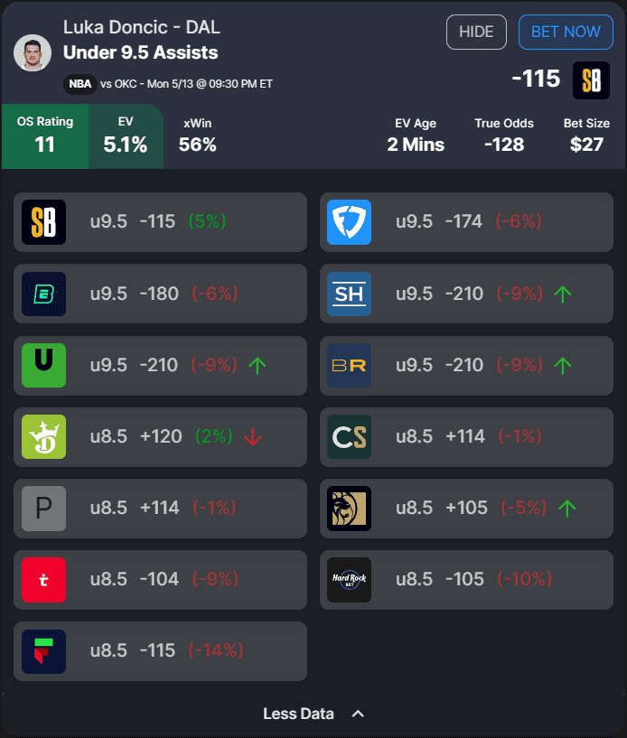 It’ll be crucial for the Thunder to keep slowing down superstar Luka Doncic, who is averaging 23.3 points, 10.3 rebounds and seven assists per game this series. Those are well below his regular season averages of 33.9, 9.2 and 9.8, but OKC’s defense, combined with Doncic’s knee sprain and ankle soreness, have been a limitation. Fortunately for us, our NBA +EV betting tools reveal a massively off-market Doncic under with oodles of positive expected value (+EV):