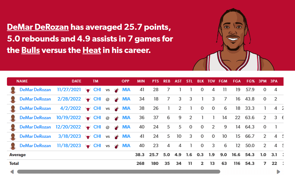 DeRozan has an impressive resume against the Heat as a member of the Chicago Bulls, but his high volume is a necessary part of that story. DeRozan is averaging 25.7 points per game but in 38.3 minutes per game. This year, DeRozan is averaging 21.5 points in 35.4 minutes, putting him on pace for lows in both metrics since joining the Bulls. I’m not expecting another big showing for DeRozan against the Heat tonight.