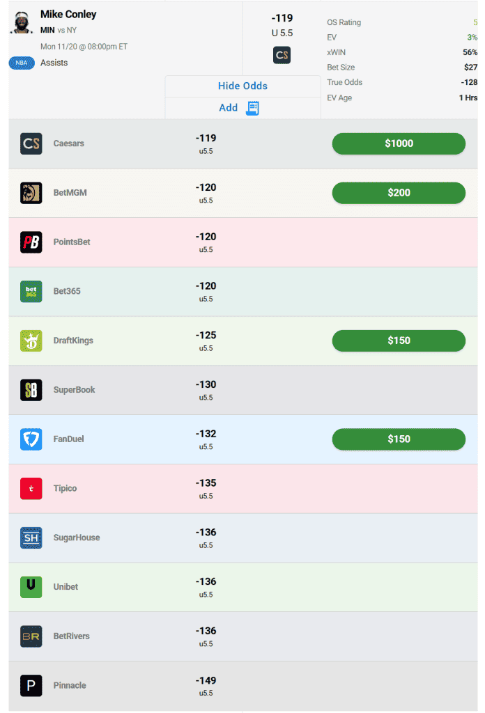 Our NBA betting tools want action on this Mike Conley prop today. The pricing disparity across the market points to serious value in this spot: Pinnacle, a sharp book, lists Conley’s under at -149, which is far below where the public books are taking action, especially Caesars.