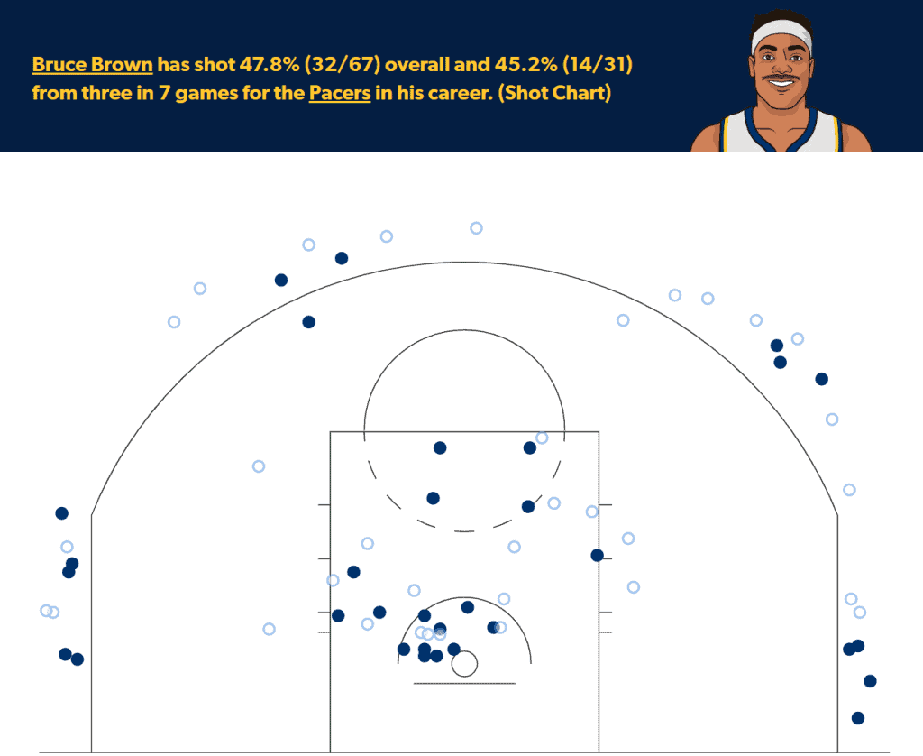 The Indiana Pacers probably weren’t a feisty wing away from contending for an NBA Championship, but they went out and brought in Bruce Brown from Denver anyway. Brown has played fine for them thus far — he is averaging 2 3-pointers per game on 45.2% from beyond the arc while contributing plenty in other statistical categories. With a home matchup against the Utah Jazz on the schedule, I’m trusting Brown to make another splash.