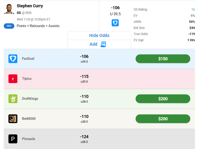 Our NBA betting tools want action on this Stephen Curry under today. You’ll find his PRA total set to 39.5 — slightly less than his season average (40) but far less than his average in Denver last year (33). With Pinnacle taking action on the under 38.5 at -124, we’re getting a one-PRA discount for a better price.