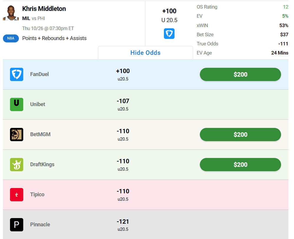 Our NBA betting tools love this Khris Middleton under today. You’ll find his points, rebounds and assists total set to 20.5 points with the under priced at +100 (50%) on FanDuel, which is worse than the true odds of -111 (52.6%). OddsShopper calculates true odds by indexing odds available at all books and adjusting for book sharpness and hold.