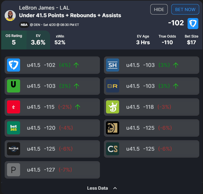 As you can see, we’re beating the market by a considerable amount by betting this at FanDuel. You’ll find James priced at -102 to stay under the 41.5 there, but he’ll cost you -115 or more elsewhere, including -127 at Pinnacle, a sharp book. By using OddsShopper Premium, you can easily find bets that have positive expected value (+EV) like this one.