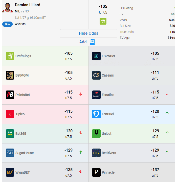 Stats aside, our NBA betting tools want action on this Damian Lillard under today because of a clear market inefficiency. The under 7.5 is priced at only -105 (51.2%) at DraftKings — which is worse than the true odds of -115 (53.5%). Pinnacle, a sharp book, lists the under 7.5 for -137 (58.7%). OddsShopper calculates true odds by indexing odds available at all books and adjusting for book sharpness and hold.