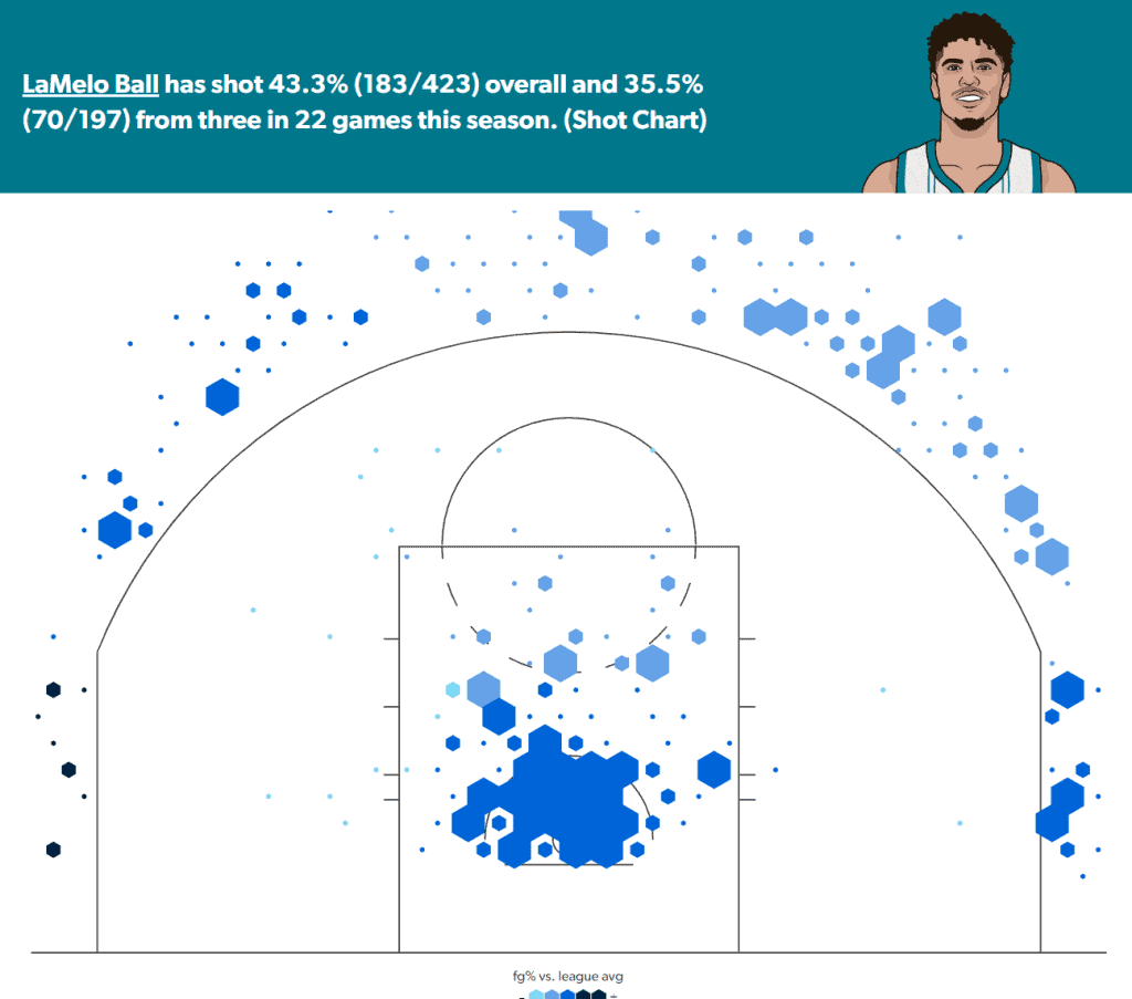 Look, LaMelo Ball is not an efficient shooter. His shot chart tells you that much: his shooting splits of 43/36/87 aren’t impressing anyone, least of all me. However, his last few games have gone even poorly than usual — he is shooting a truly dreadful 35/17/80 through that stretch. But instead of expecting him to stay cold, we’re buying the dip on him.