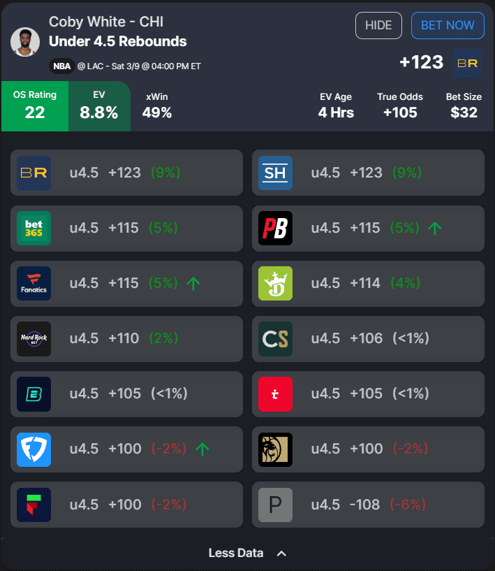 Our NBA betting tools want action on this Coby White under today due to an obvious market inefficiency. The under 4.5 rebounds will cost you +123 (44.8%) at BetRivers and SugarHouse, which is a better number than the true odds of +105 (48.8%). Pinnacle, a sharp book, lists the under 4.5 for -108 (51.9%). OddsShopper calculates true odds by indexing odds available at all books and adjusting for book sharpness and hold.