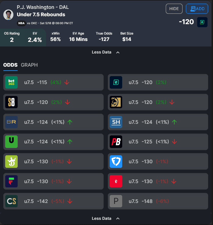 While I’m skeptical of Washington’s ability to keep this up, we’re getting action on this NBA player prop pick mostly due to the odds we’re getting at bet365 and ESPNBET. His rebound prop (7.5) is at the same number across the market, but the under will cost only -115 at bet365 and -120 at ESPNBET despite clocking in at a far less friendly -148 at Pinnacle, a sharp book. Our NBA +EV betting tools reveal this pricing split offers us plenty of positive expected value (+EV):