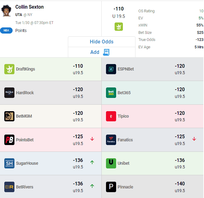 Stats aside, our NBA betting tools want action on this Collin Sexton under today because of the clear market inefficiency. The under 19.5 is priced at only -110 (52.4%) at DraftKings — which is worse than the true odds of -123 (55.2%). Pinnacle, a sharp book, lists the over under 19.5 for -140 (58.3%). OddsShopper calculates true odds by indexing odds available at all books and adjusting for book sharpness and hold.