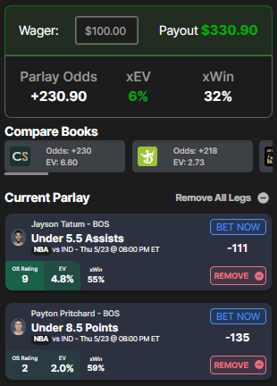 There is danger in Pritchard’s efficiency — 73.2% true shooting over the last six games. However, the under has a 59% chance of hitting per OddsShopper’s model, and the -135 juice is still below the -142 True Odds, giving this bet a 2% edge at Caesars. All together, that gets the parlay to +230 odds for 6% +EV and a 32% expected win rate.