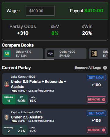 All that said, OddsShopper is going with this as a 50-50 prop, but the +105 odds are what make this a +EV play and worthwhile add to our SGP. On its own, taking Pritchard under 2.5 assists gets us a 2.7% positive edge. As part of the parlay, it gets us over +300 for total odds, while the total expected win rate is still workable at 26%. Ideally we would get closer to 30%, but we can live in the mid- to high-20s.