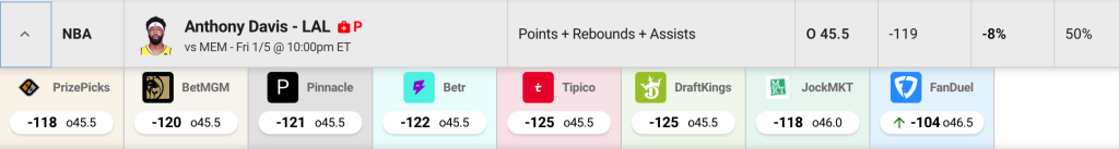 Taking a look at OddsShopper’s Positive EV Bets tool, we see that all other operators are juiced to the over of 45.5 PRA, while FanDuel has this at 46.5. Davis get’s a 2% usage bump without D’Angelo Russell, who is doubtful to play tonight, another added bonus for the more than play.
