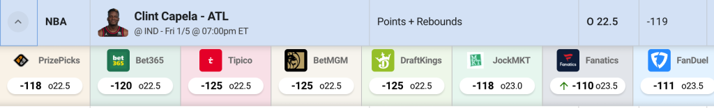 Capela is 10th in the NBA with 17 rebound chances per game and has increased that number to 18.7 over his last 10. Even with Jalen Johnson back in the mix, Capela’s numbers have gone up, grabbing 14.3 rebounds in the last three games. The total for this game opened at 263, an NBA record. In addition, OddsShopper tells us there is good value on more than 22.5, with other books juiced to the over and some listing this projection at 23.5.