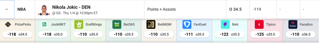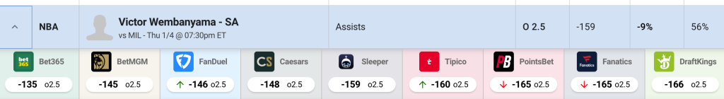 Taking a look at OddsShopper’s Positive EV Bets tool, we see that all other operators are heavy on the over of 2.5 assists, with odds ranging from -135 to -166. I’m banking on Wembanyama getting to three assists tonight.